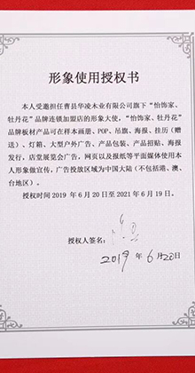 “牡丹花”“怡飾家”品牌是公司主營的注冊商標(biāo),并與明星句號達成合作。14年的板材專業(yè)精神和持續(xù)穩(wěn)健的行業(yè)資源優(yōu)化整合。